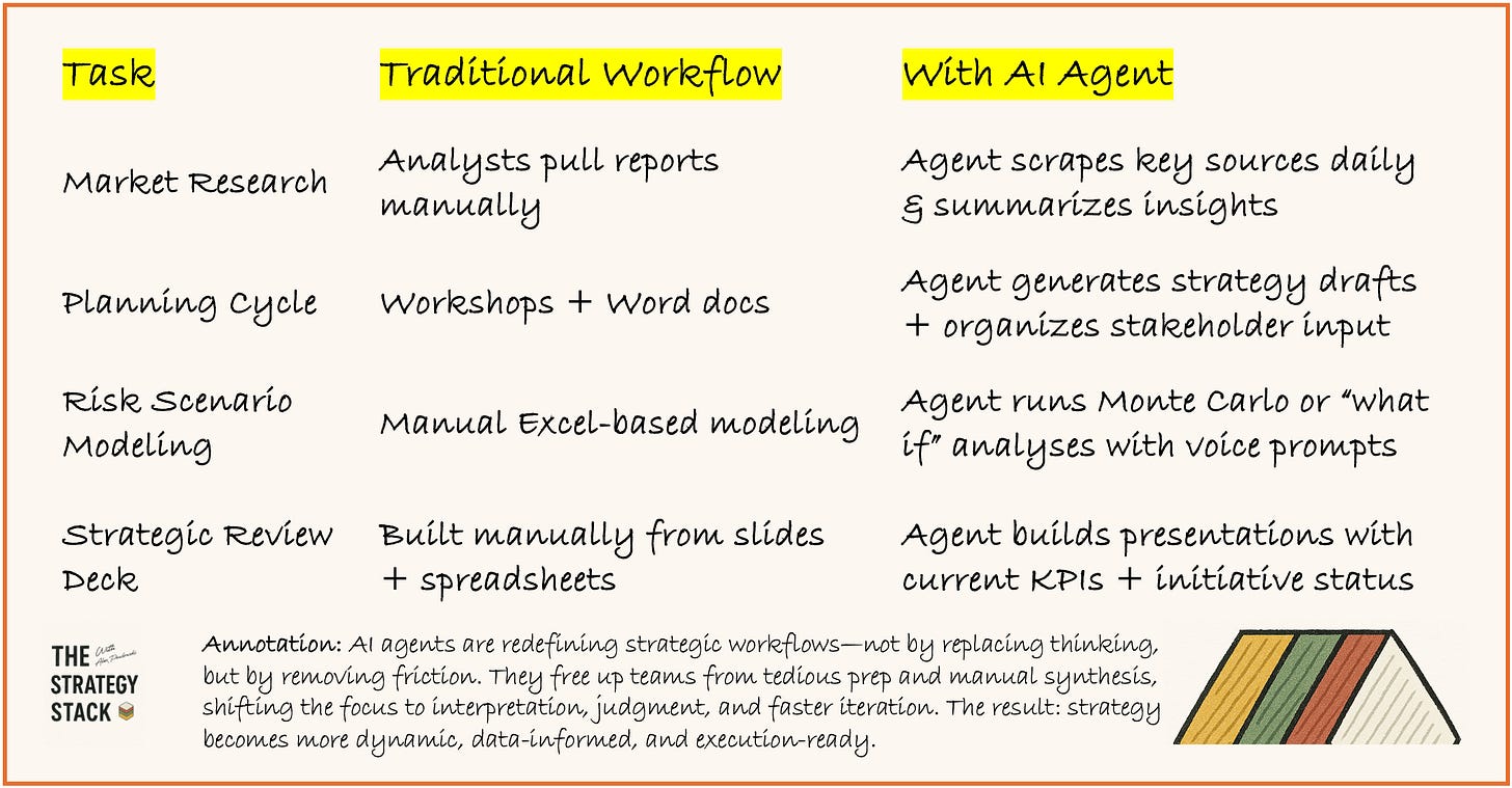 This issue explores how AI agents can fundamentally transform the way strategic planning, market research, competitive analysis, and initiative tracking are done — with real use cases, agent recipes, and implementation steps you can use right away.