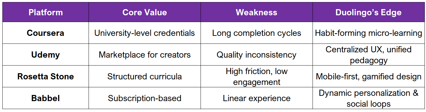 While most EdTech players fight over content libraries and B2B partnerships, Duolingo redefined the battlefield > moving from knowledge delivery to habit design.
