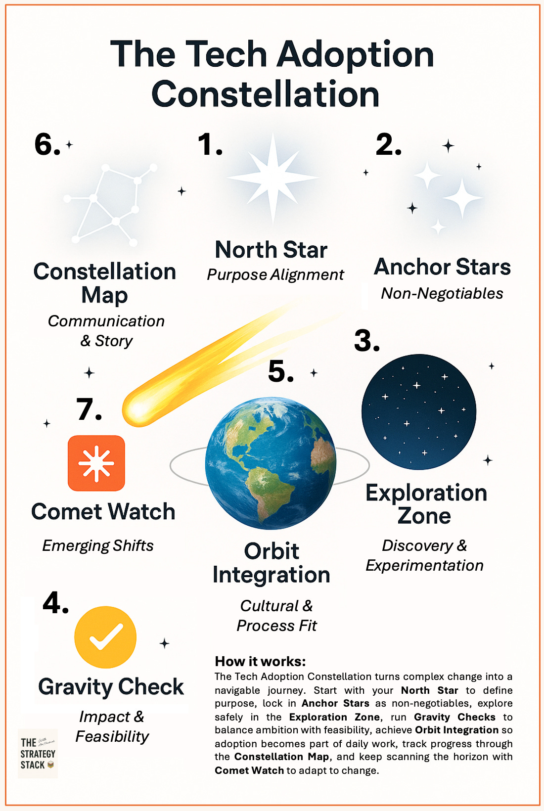 That’s where The Tech Adoption Constellation comes in — a strategy framework that helps organizations navigate from pilot to full transformation with clarity, confidence, and cultural alignment.