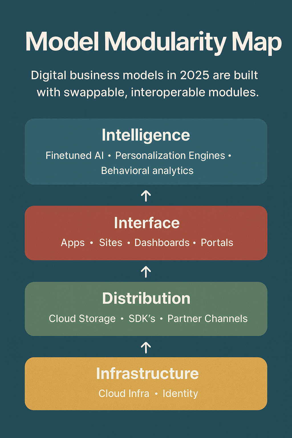 Executive (inside-out): Infrastructure → Distribution → Interface → Intelligence — shows where your moat (and dependencies) really are.