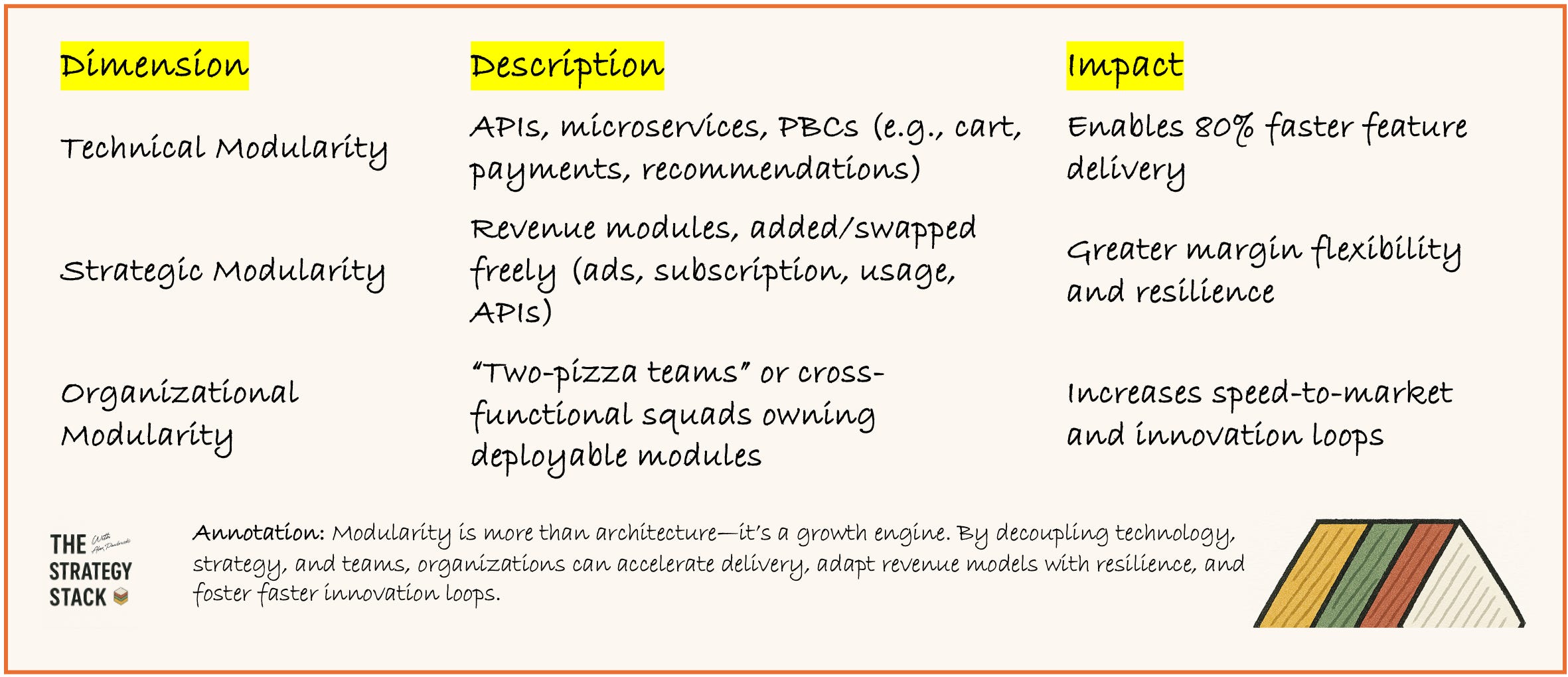 Three dimensions of modularity: Technical (APIs/microservices), Strategic (swappable monetization layers), Organizational (team-owned modules).