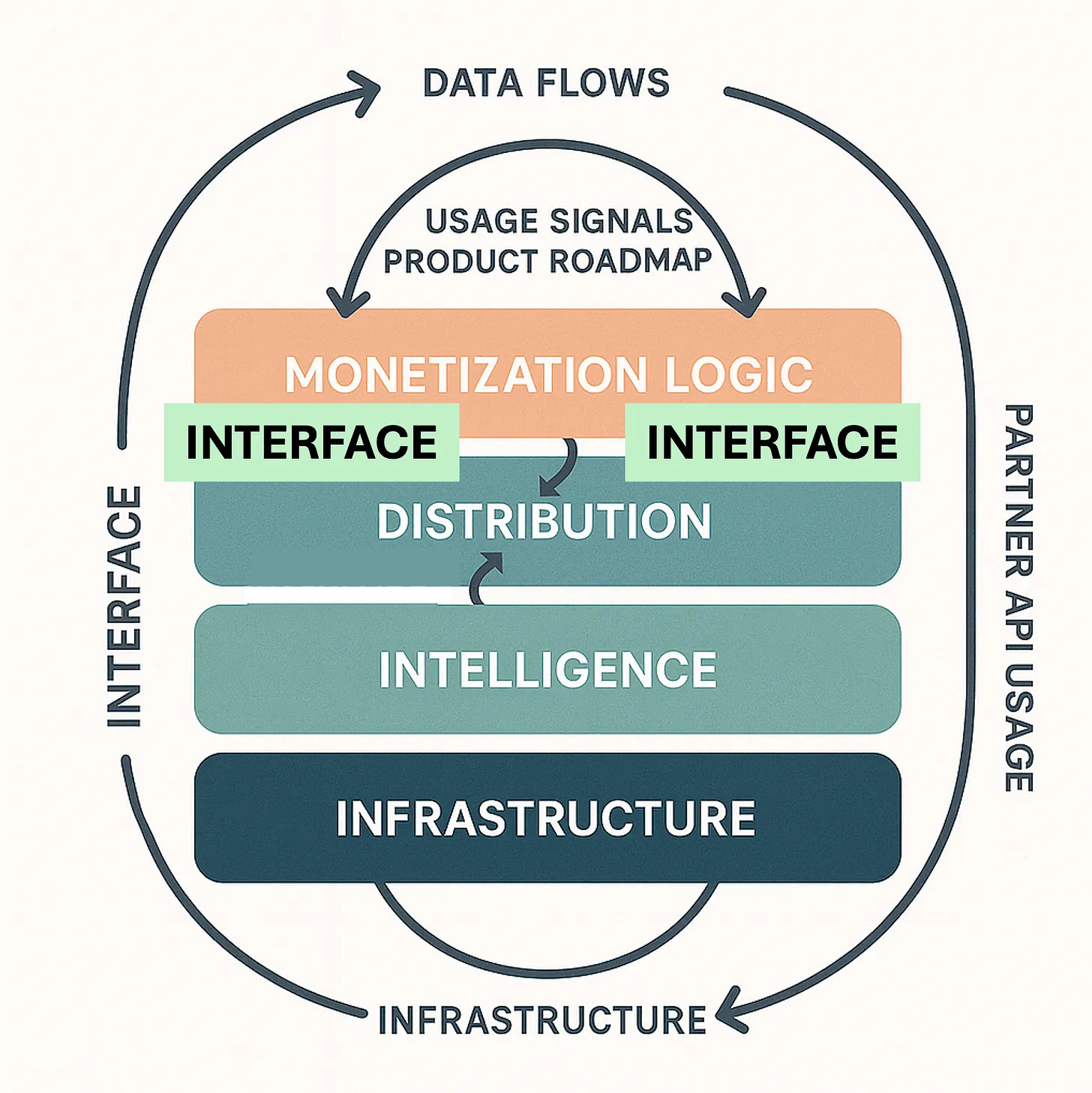 Modern firms operate across five layers: Infrastructure, Intelligence, Distribution, Interface, and Monetization.